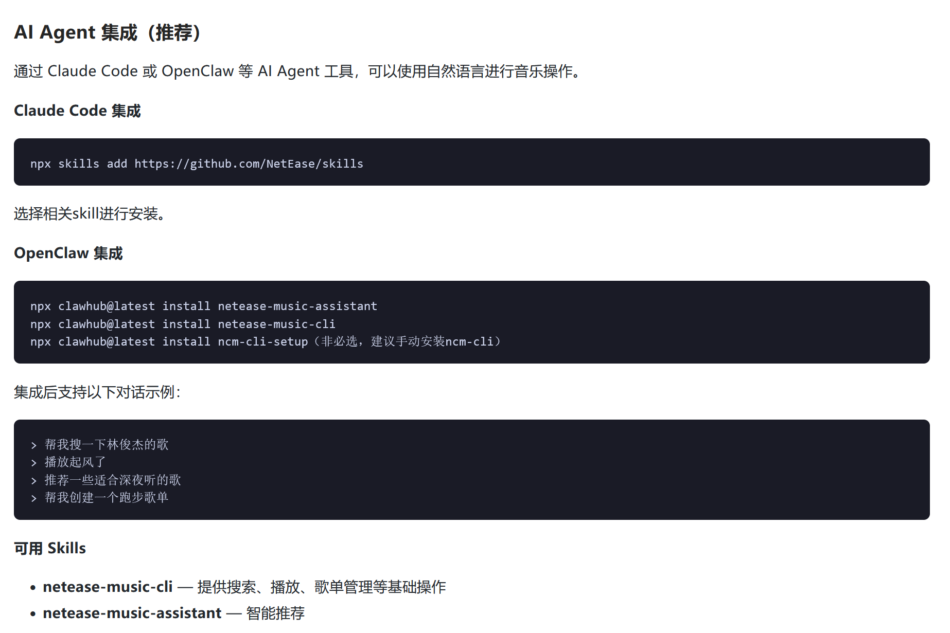 网易云音乐同步上线相关的 Skill,并全面接入 OpenClaw 平台,使得开发者可以通过自然语言对话的方式灵活调用其音乐服务能力。