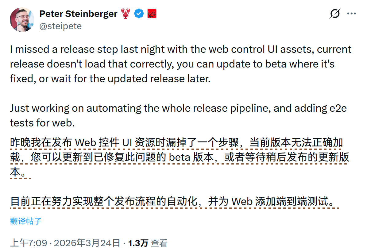 然而,在该版本发布后,官方承认由于发布流程遗漏,导致 npm 包缺失了 dist/control-ui/ 目录,使得用户升级后无法加载控制台界面。