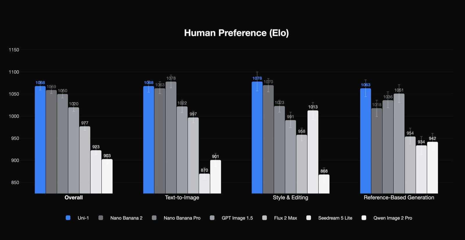 根据官方提供的数据,Uni-1 在 RISEBench 推理基准测试中达到了最先进(SOTA)水平,并在人类偏好 Elo 评测中的总评、风格与编辑以及参考生成类别中排名第一。