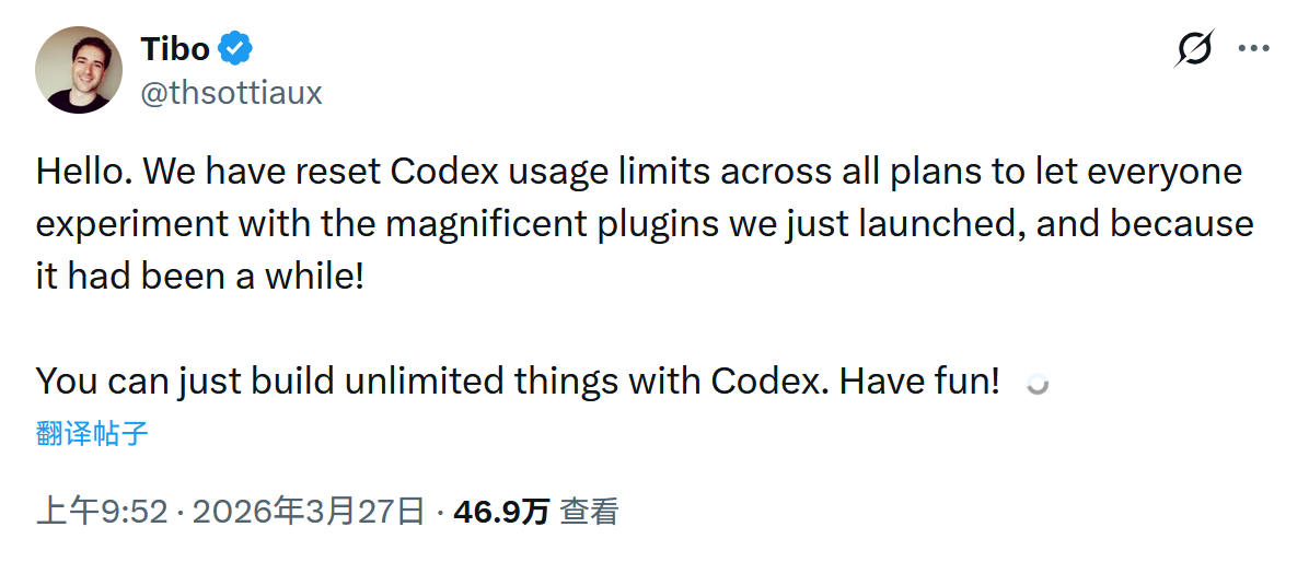 北京时间3月27日上午约十点,OpenAI Codex 负责人 Thibault Sottiaux 宣布,为配合新上线的插件系统,官方已重置所有套餐的 Codex 用量限额。
