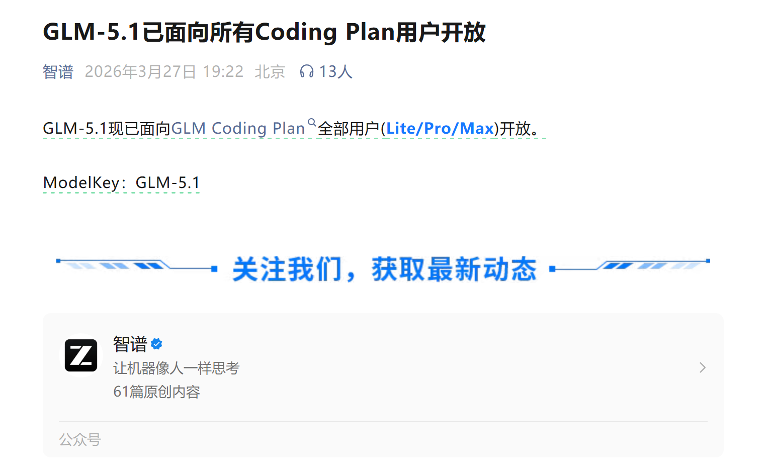 智谱向 GLM Coding Plan 用户开放 GLM-5.1 模型使用 #1