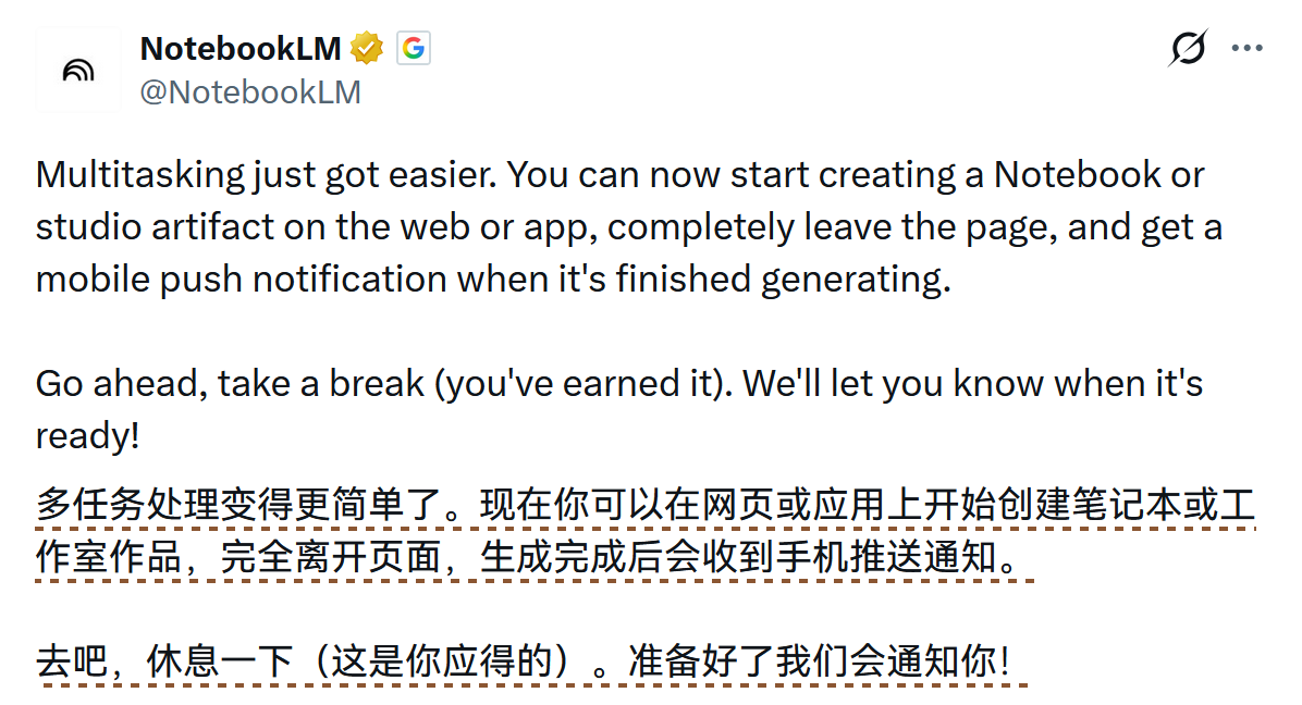 NotebookLM 现已上线后台生成与移动端推送通知功能。用户在网页或 App 端创建 Notebook 及 studio artifact 时,可直接离开当前页面,系统会在内容生成完毕后自动向移动设备发送提醒。