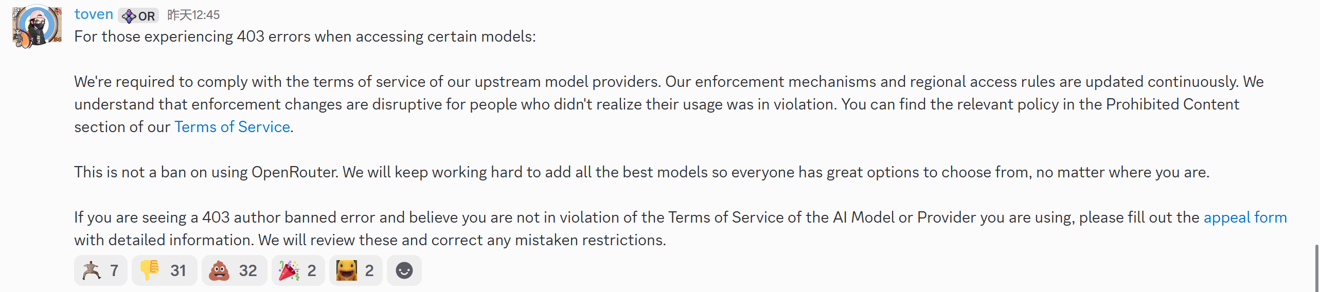 403 Author Banned。OpenRouter 称该举措系遵守上游提供商要求。