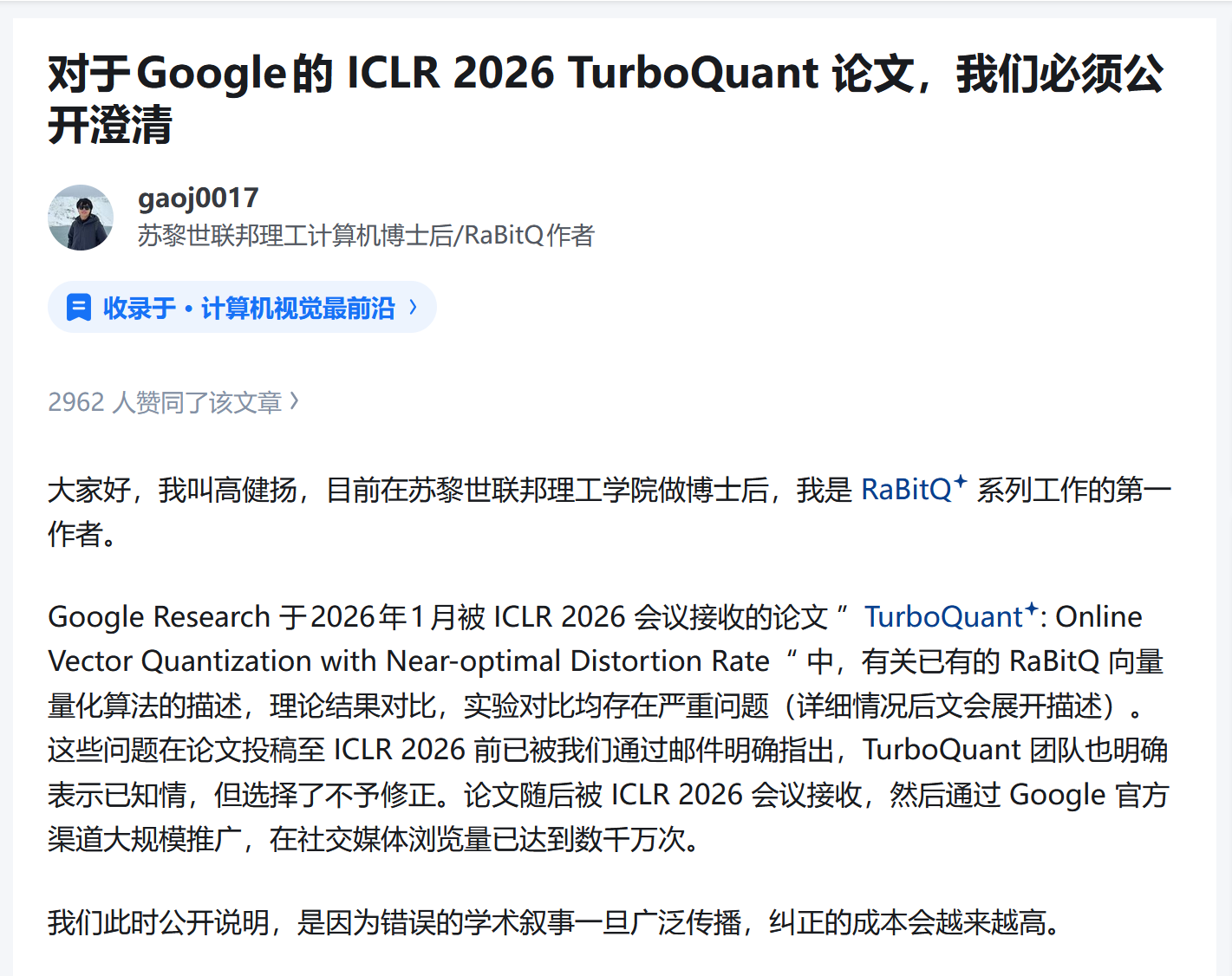 据苏黎世联邦理工学院博士后、RaBitQ 系列工作第一作者高健扬发布的公开声明指出,Google Research 近期被 ICLR 2026 会议接收的论文《TurboQuant: Online Vector Quantization with Near-optimal Distortion Rate》存在学术不端嫌疑。