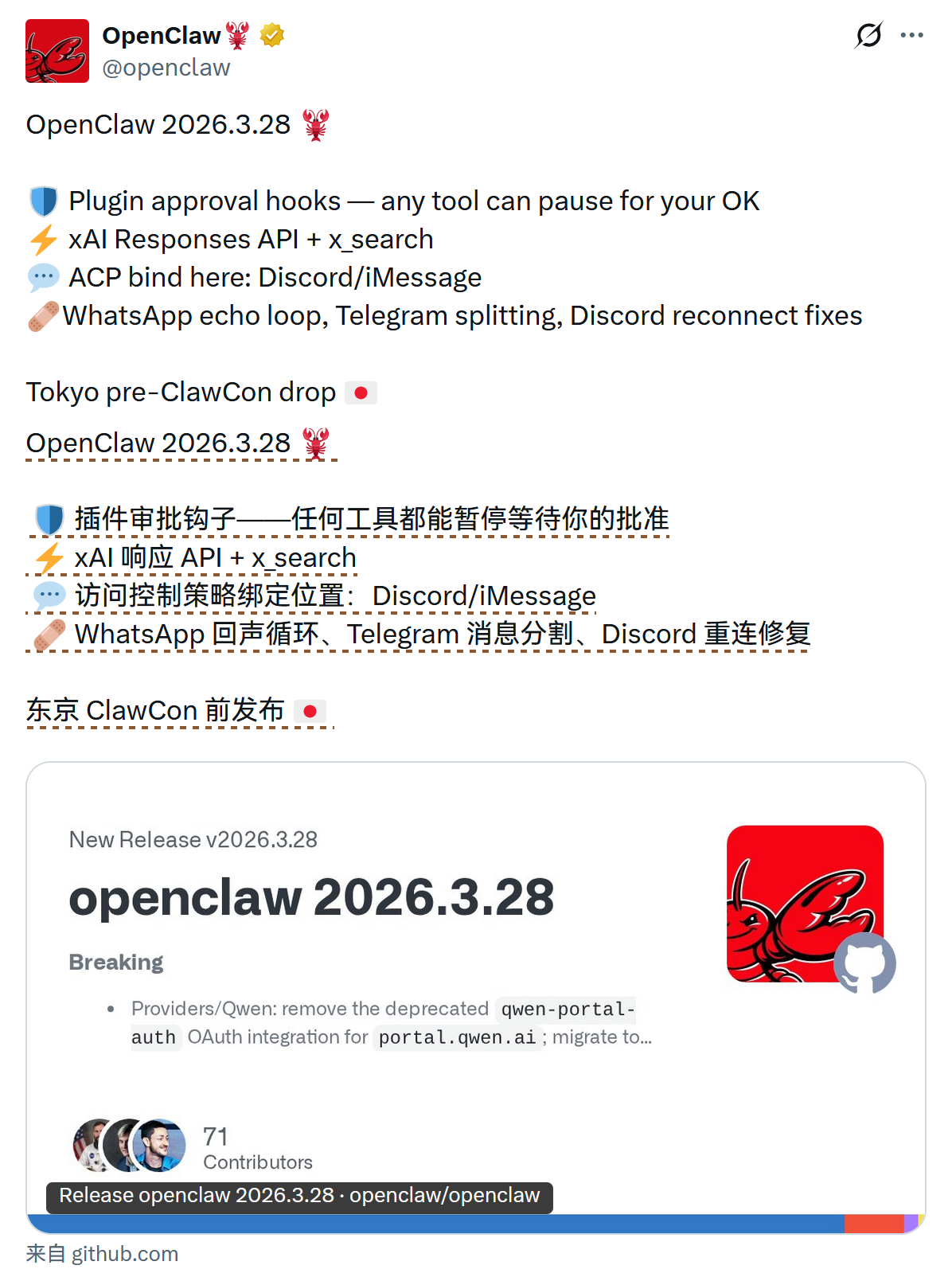 OpenClaw 官方发布了标识为 2026.3.28 的最新版本更新。此次发布被官方定位于 ClawCon 大会前在东京推出的预热版本。