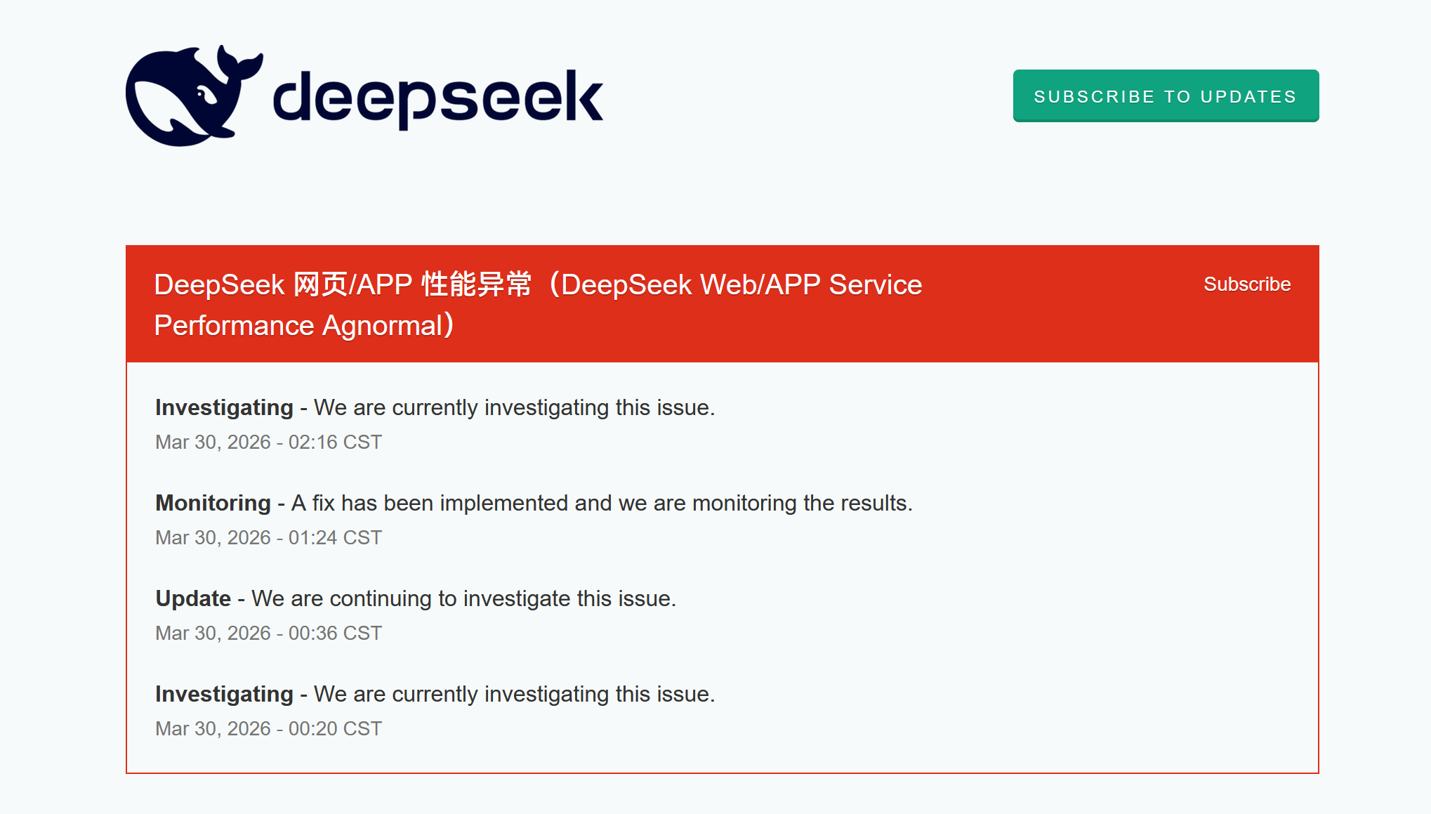 DeepSeek 网页与 APP 的对话服务自昨夜起出现连续异常。官方状态页显示,晚间 21 时许发生服务异常。官方团队在定位问题并实施修复后,于当夜 23 时许将此事件标记为已解决。