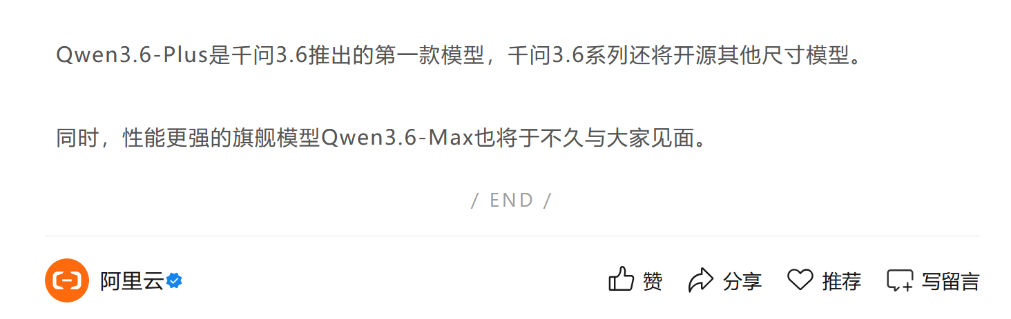 该团队表示,后续将开源更小规模的模型版本,性能更强的旗舰模型 Qwen3.6-Max 也将很快发布。