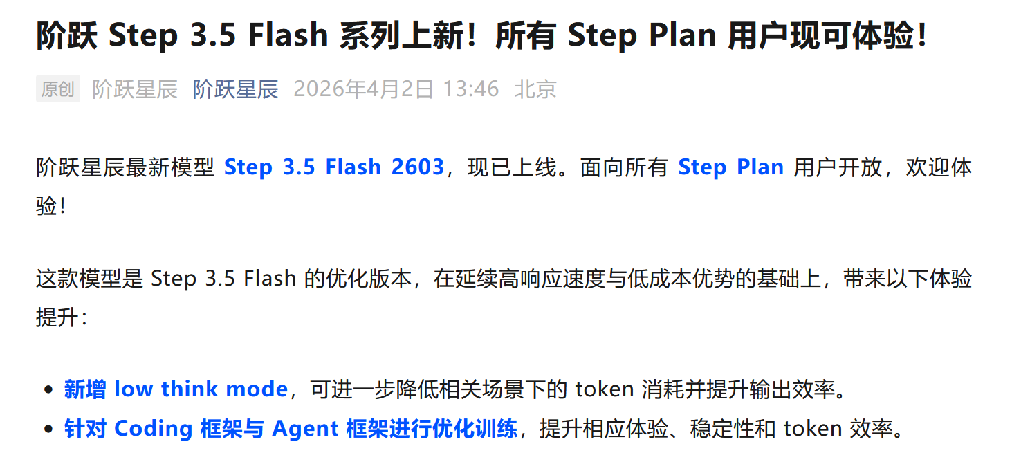 阶跃星辰宣布其最新优化的 Step 3.5 Flash 2603 模型正式上线,现已面向所有 Step Plan 用户开放体验。