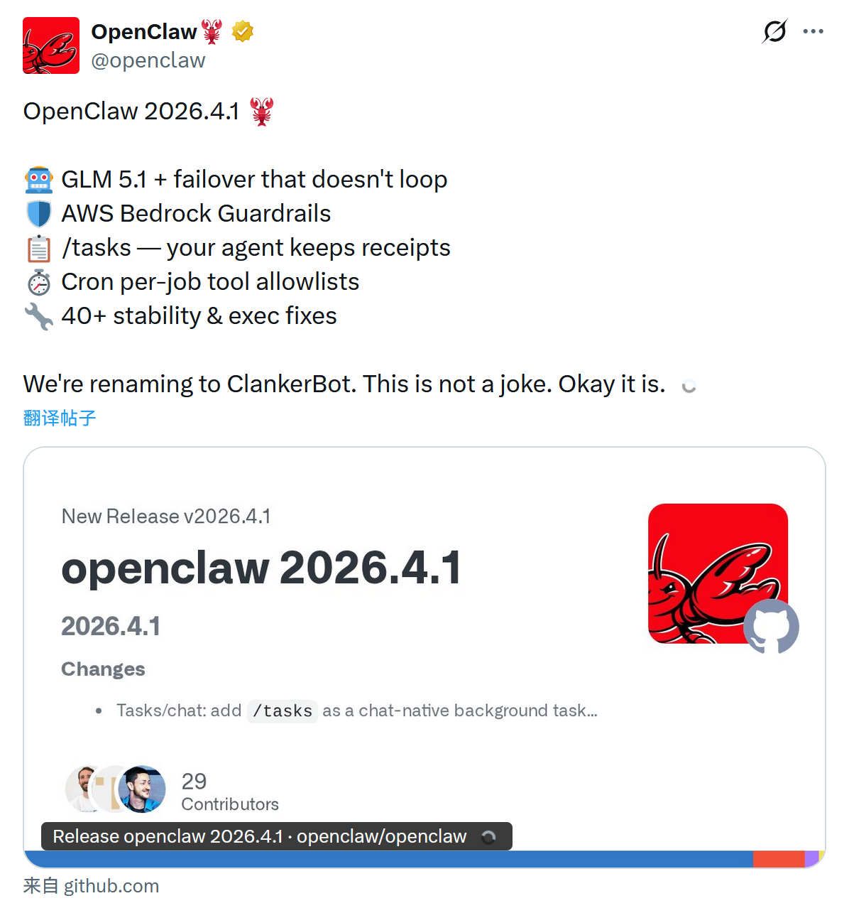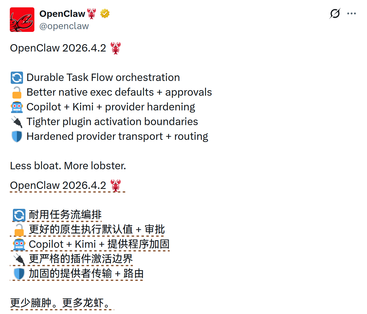 #11 - OpenClaw 发布 2026.4.1 与 4.2 版 ↗