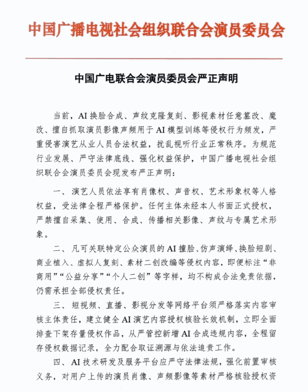 中广联合会演员委员会发布声明,严禁未授权 AI 侵权 #19
