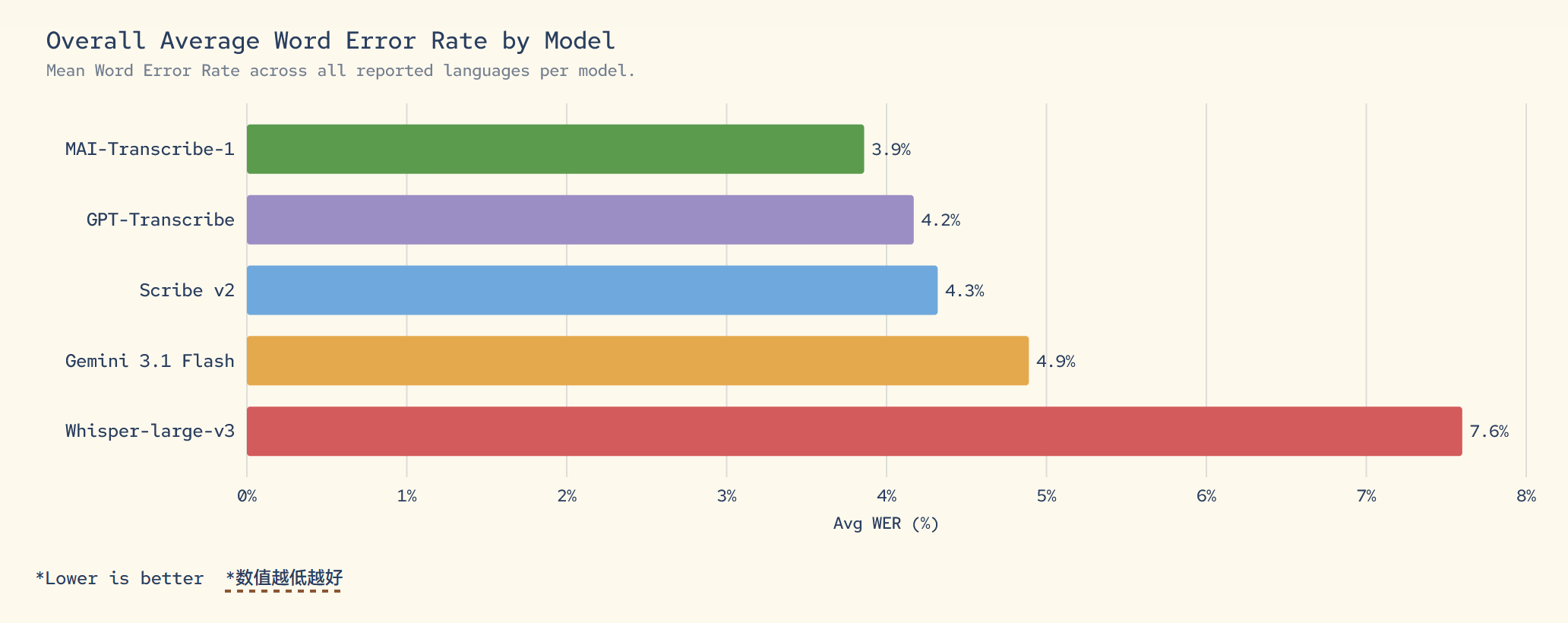 MAI-Transcribe-1,该模型支持中文,并以 3.9% 的词错率在 25 种语言测试中击败竞品位居第一。目前该模型已上线 Microsoft Foundry,并整合至 Copilot 语音模式。
