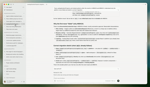 在全新的 Agent 界面中,开发团队采用了全新的系统架构,摆脱了以往的部分约束,统一了跨桌面端、Web 端和 CLI 端的核心 Agent harness,并引入 React Compiler 显著提升了性能表现。