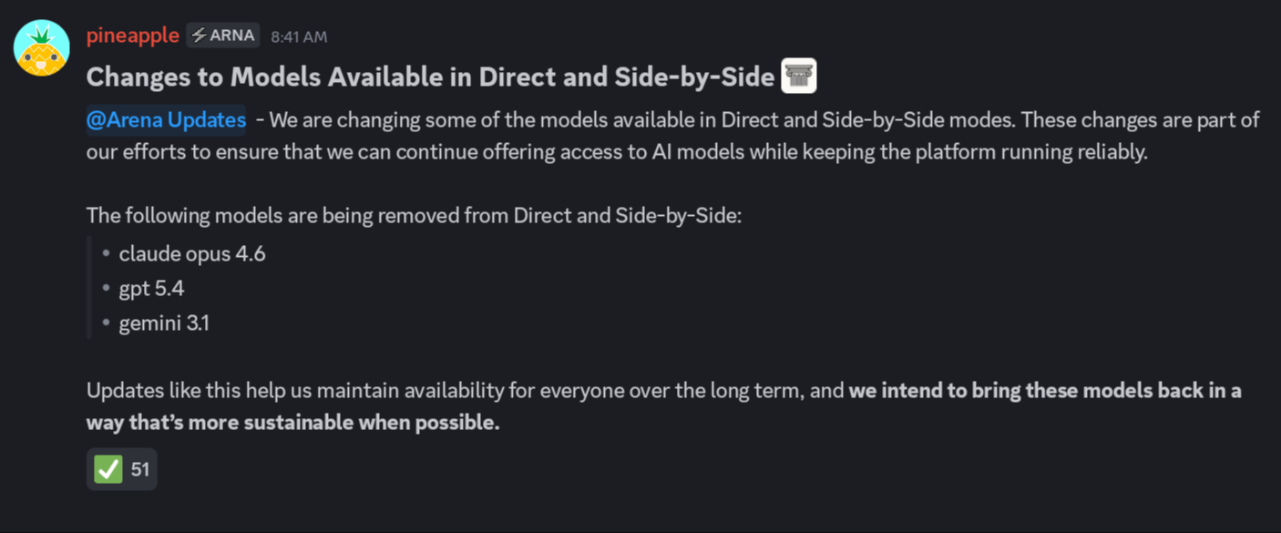 LMArena为保障平台长期稳定运行,已暂时下架 Claude Opus 4.6、GPT 5.4 及 Gemini 3.1 三款尖端模型。