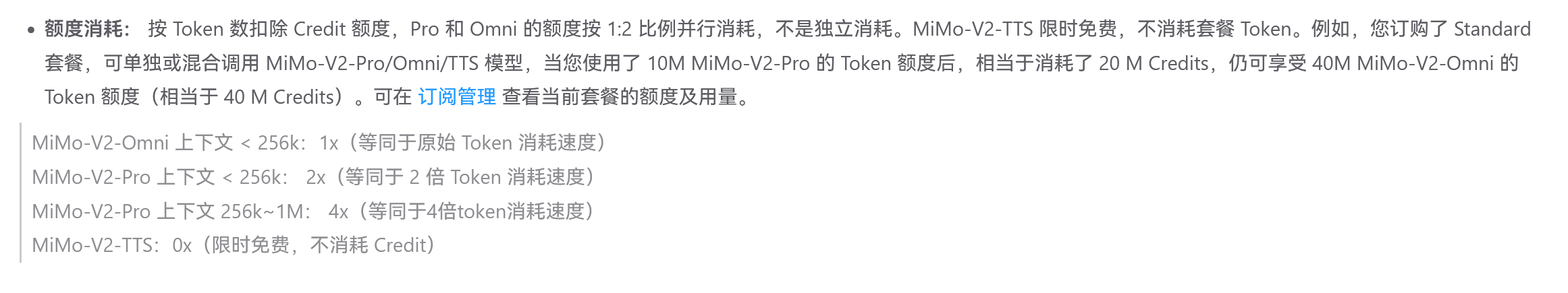 其中,调用 MiMo-V2-Pro 时,上下文 < 256k 消耗 2 倍 Credit,上下文 256k~1M 消耗 4 倍 Credit。