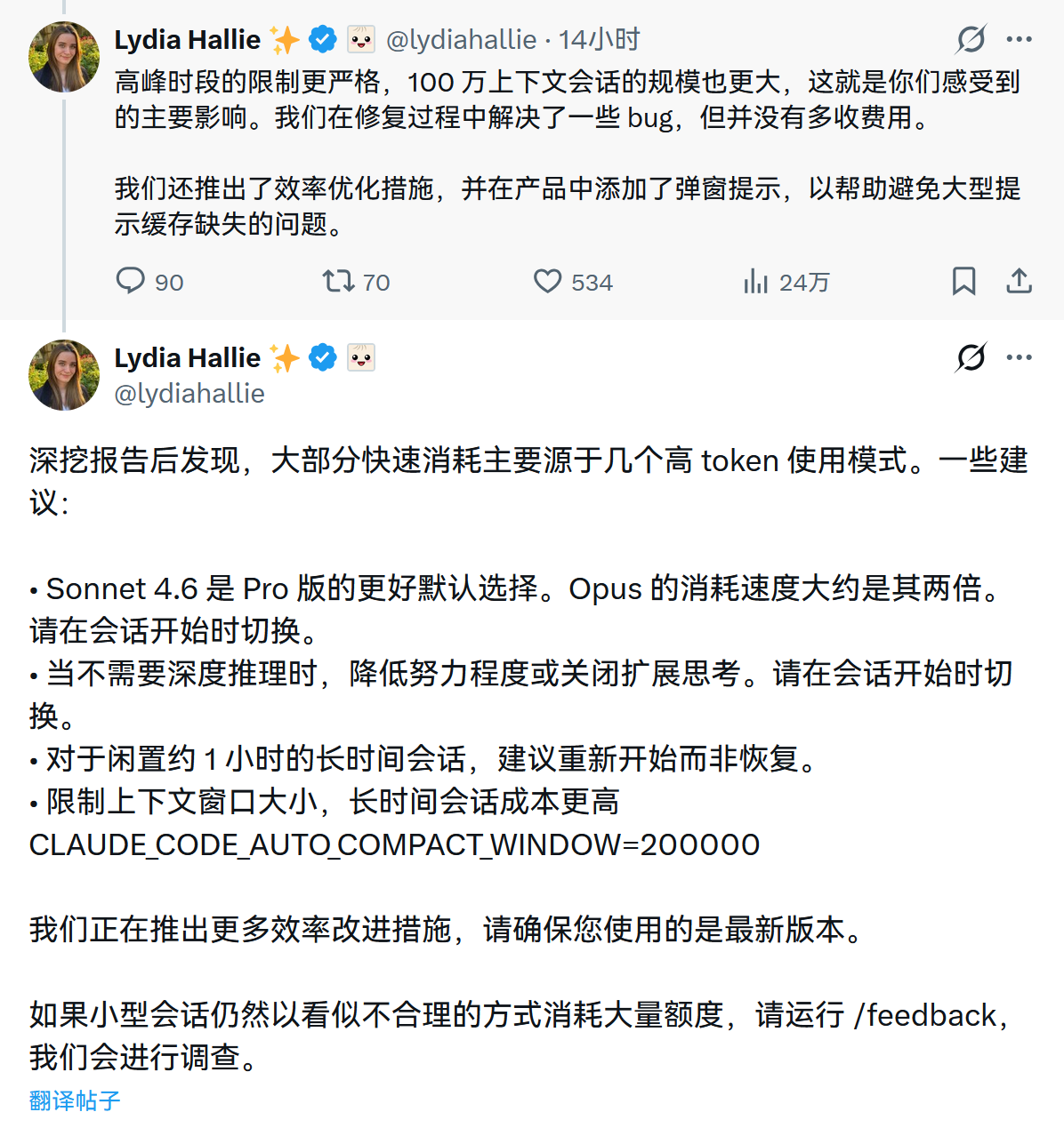 Anthropic 员工 Lydia Hallie 回应了近期用户遭遇额度异常消耗的问题,称高峰时段额度有所收紧,且 100 万 token 上下文会话消耗巨大。