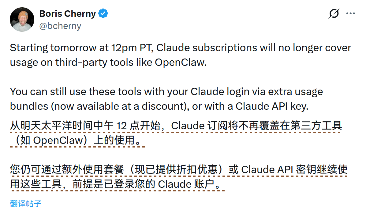 Anthropic 宣布自本周五中午起调整 Claude 计费策略。订阅不再支持 OpenClaw 等第三方工具,用户需单独付费开通“extra usage”或使用 API 密钥。官方称此举因第三方工具带来系统压力,需优先保障核心产品算力。