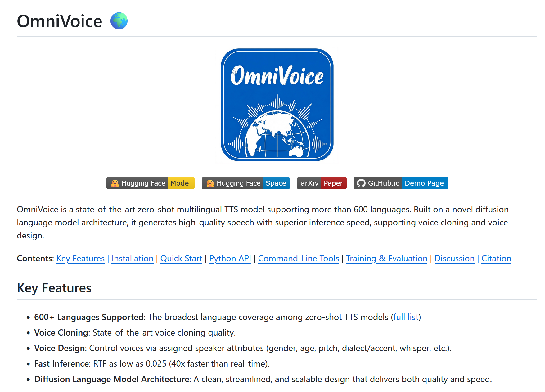 #2 - 研究团队开源 OmniVoice 覆盖 600 种语言零样本 TTS 模型 ↗