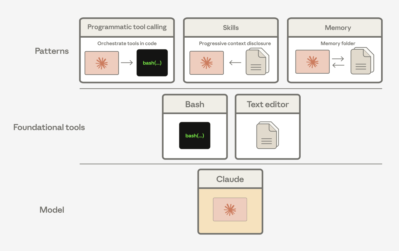 bash和text editor,将编排与上下文管理权交还给模型,并利用优化提示词缓存及声明式工具降低成本、把控安全边界。