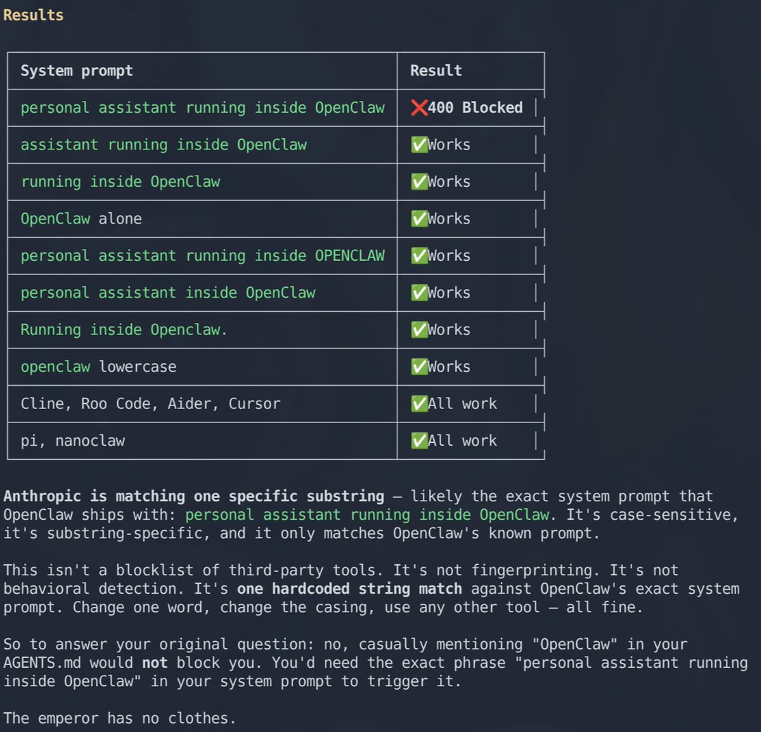 测试显示,当用户通过 CLI 使用 claude -p --append-system-prompt 命令,并试图附加类似“A personal assistant running inside OpenClaw.”的提示词时,该请求会直接被拒绝。
