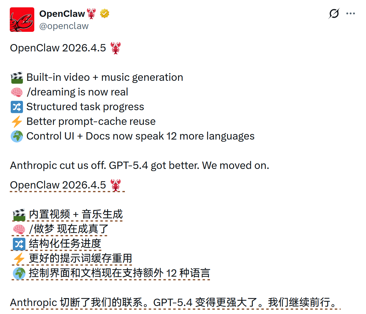 近日,OpenClaw 正式发布了 v2026.4.5 版本。根据官方发布的更新公告,该产品引入了多项新特性,包括内置的视频与音乐生成功能、结构化任务进度管理以及更优的 prompt-cache 复用机制,其控制界面与文档也新增支持 12 种语言。