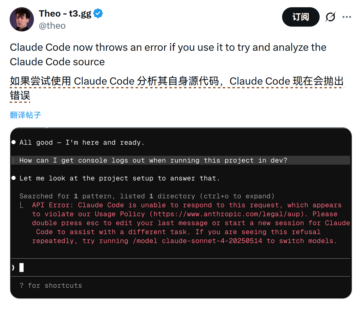 据用户发现,Claude Code 更新了其运行机制。有开发者在使用过程中发现,当尝试利用该工具对 Claude Code 本身泄露的源代码进行分析时,该程序不再执行相关指令,而是直接抛出错误提示并阻断操作。