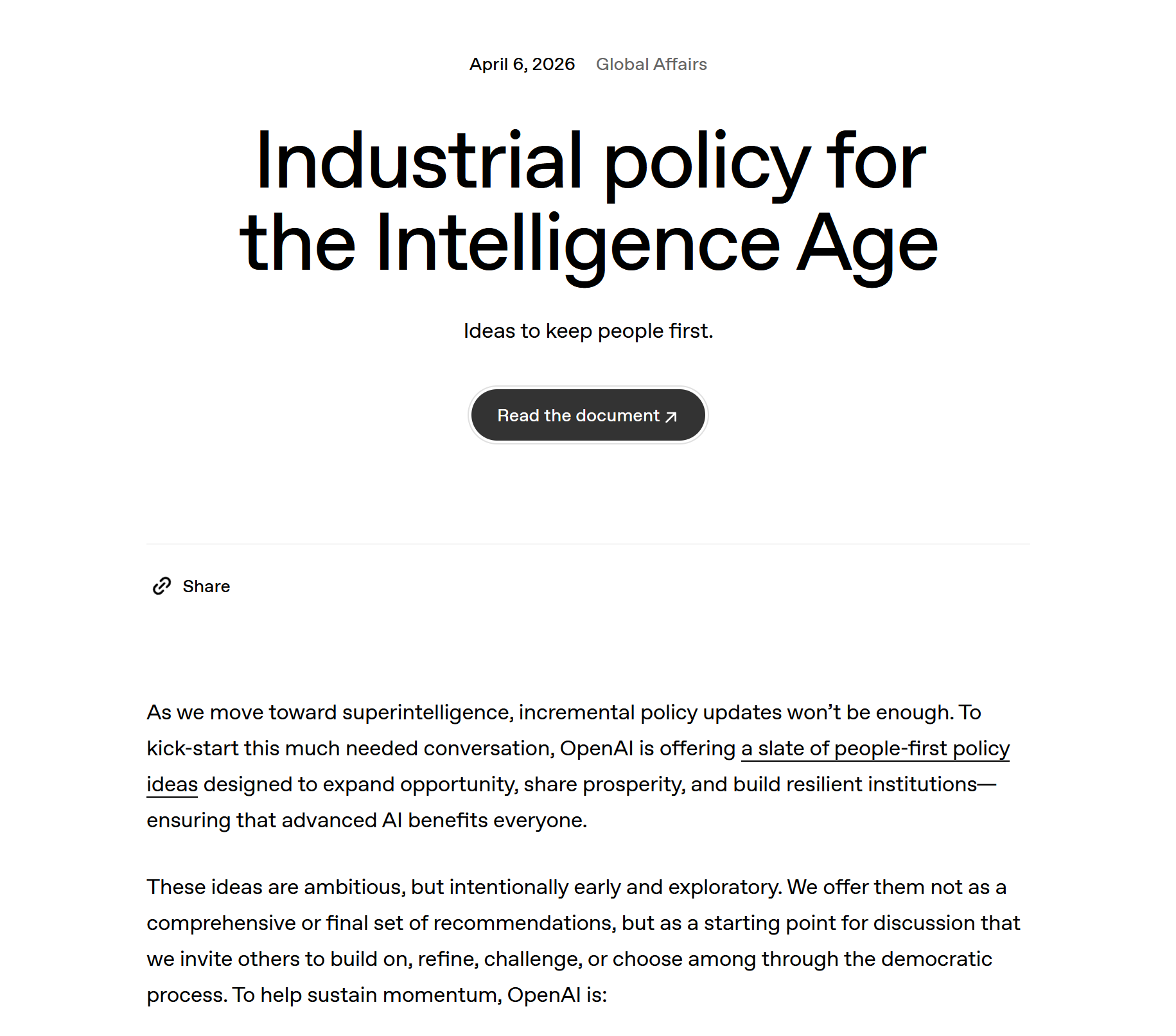 OpenAI 近日发布了一份名为《智能时代的产业政策:以人为本的构想》(Industrial Policy for the Intelligence Age: Ideas to keep people first)的 13 页蓝图。