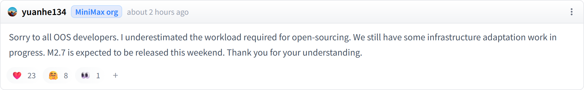 MiniMax 工作人员回应称,MiniMax-M2.7 模型预计本周末正式开源,此次发布进度的推迟主要源于团队对模型开源所需整体工作量的预估不足。