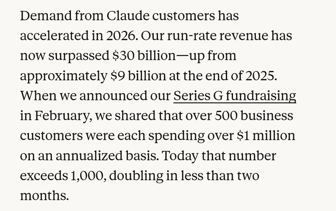 官方数据显示,该公司的年化收入已突破 300 亿美元,较 2025 年 底的约 90 亿美元 大幅增长。且年消费额超过 100 万美元 的企业客户,在不到两个月内从 500 家 翻倍至 1,000 多家。