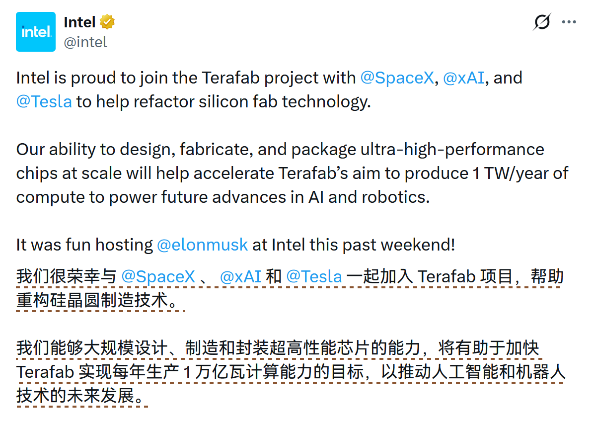 Intel 宣布加入 Elon Musk 旗下的 Terafab 芯片项目,将在得克萨斯州奥斯汀建厂,通过重构硅晶圆制造技术实现年产 1 太瓦 计算能力。