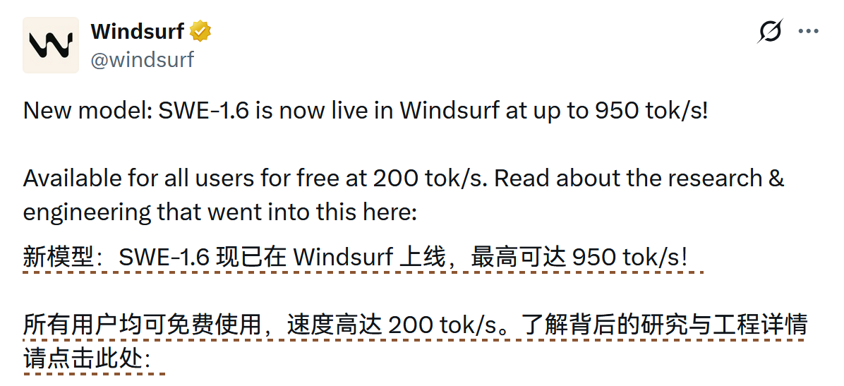 目前,SWE-1.6 已在 Windsurf 平台全面上线并面向所有人开放。