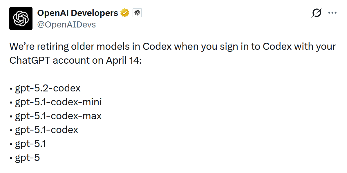 与此同时,官方计划于 4月15日 在 Codex 中下架一批较旧的模型。当用户通过 ChatGPT 账号登录使用时,将不再支持调用 gpt-5.2-codex、gpt-5.1-codex-mini、gpt-5.1-codex-max、gpt-5.1-codex、gpt-5.1 以及 gpt-5 等版本。