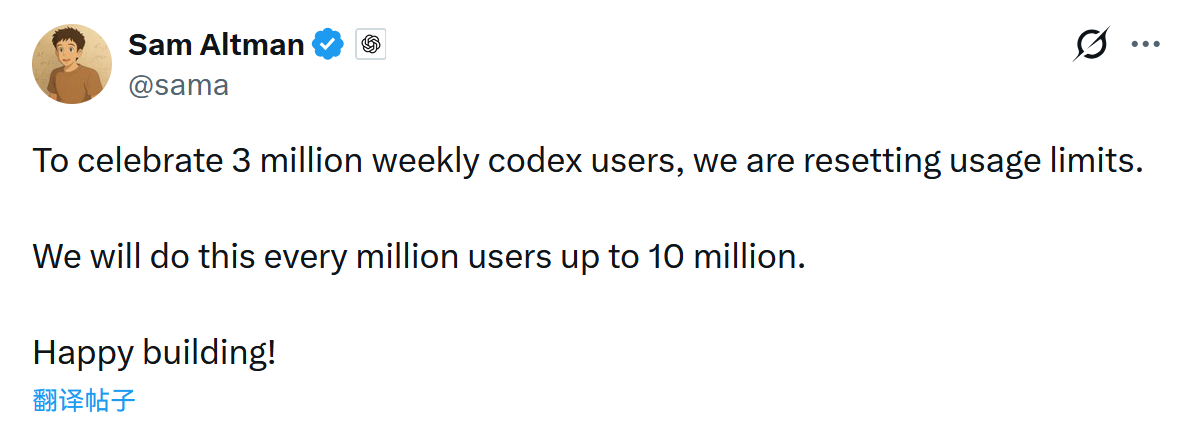 OpenAI Codex 周活破 300 万,重置速率限制 #10