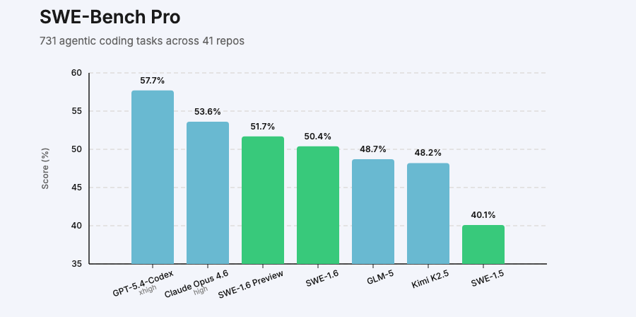 官方称其在 SWE-Bench Pro 基准测试中表现与上个月发布的 SWE-1.6 Preview 模型相当,同时显著改善了“重复推理”、“过度思考”等行为问题。